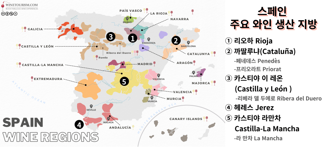 스페인의 대표 와인 생산지로는 다음과 같은 곳이 있다.