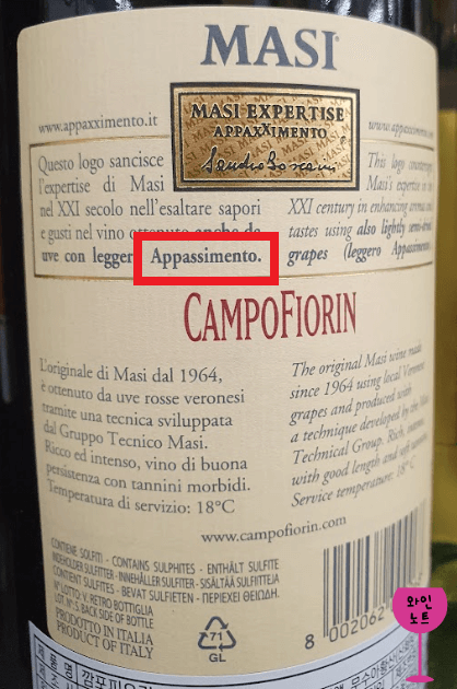 아파시멘토 Appassimento, 파시토 Passito : 포도를 건조해 당분을 집중시킨 고품질 와인을 생산하는 방식. 달콤하거나 풀바디한 드라이 스타일로 만든다.